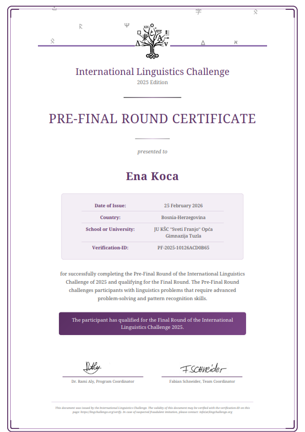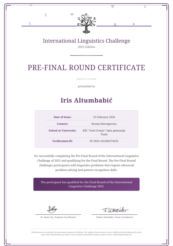 Cilj ovoga natjecanja jest razvijanje logičkog razmišljanja, analize jezika i rješavanja jezičnih zagonetki. Natjecatelji dobivaju zadatke u kojima analiziraju nepoznate jezike. Ne traži se prethodno znanje tog jezika, nego sposobnost zaključivanja. Tipovi zadataka mogu biti prevođenje riječi ili rečenica iz nepoznatog jezika, otkrivanje pravila u gramatici ili tvorbi riječi, pronalaženje značenja na temelju uzoraka u jeziku. Jezici u zadacima mogu biti stvarni (npr. japanski, svahili, mađarski) ili ponekad izmišljeni, a testiraju se logika i analitičko razmišljanje, sposobnost uočavanja obrazaca i razumijevanje strukture jezika. U iščekivanju finala naše su učenice nagrađene prikladnim međunarodnim diplomama. Podrška učenicama je profesor Alen Matošević.