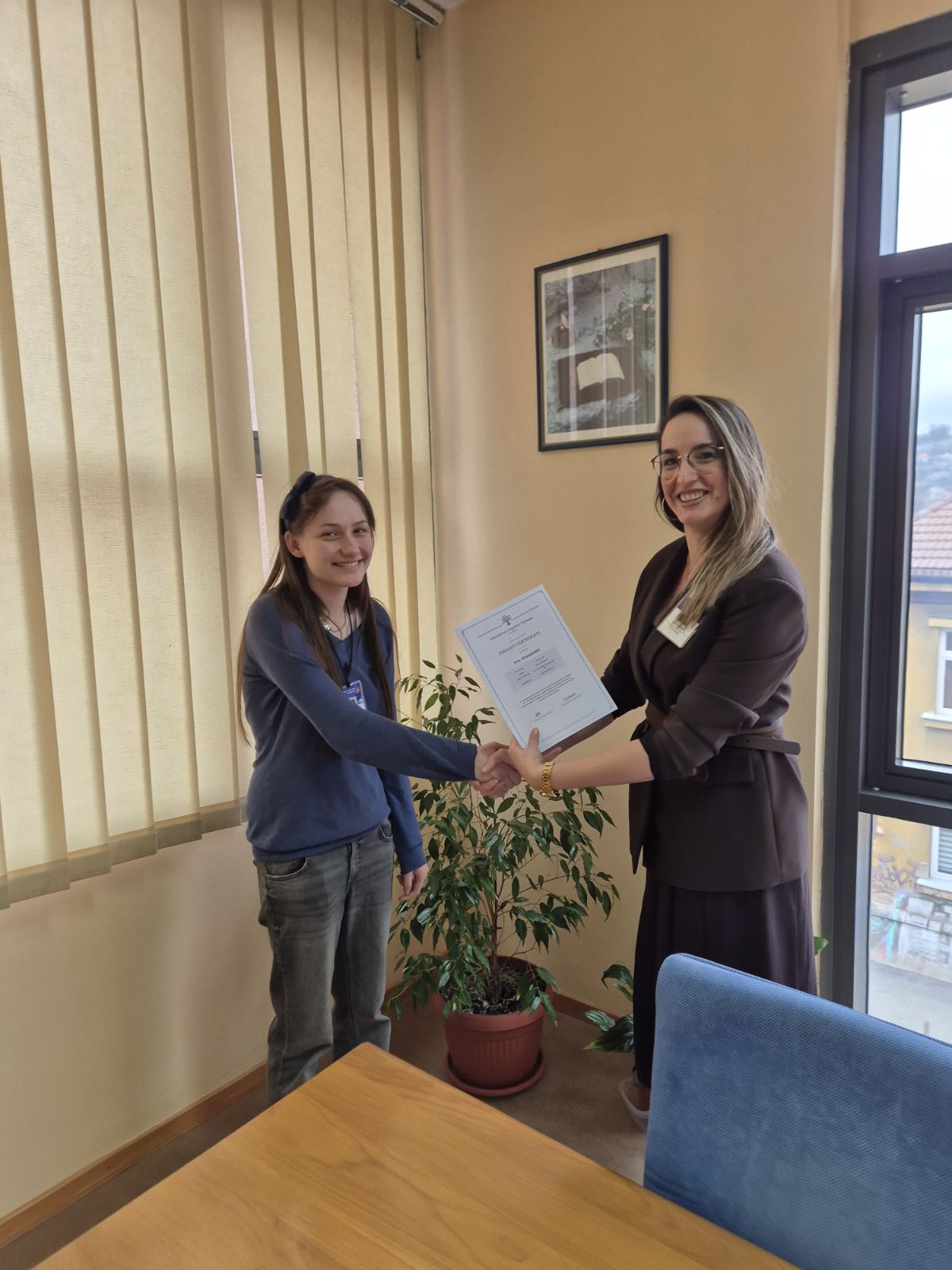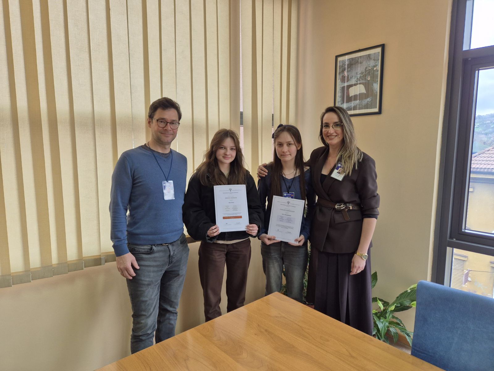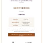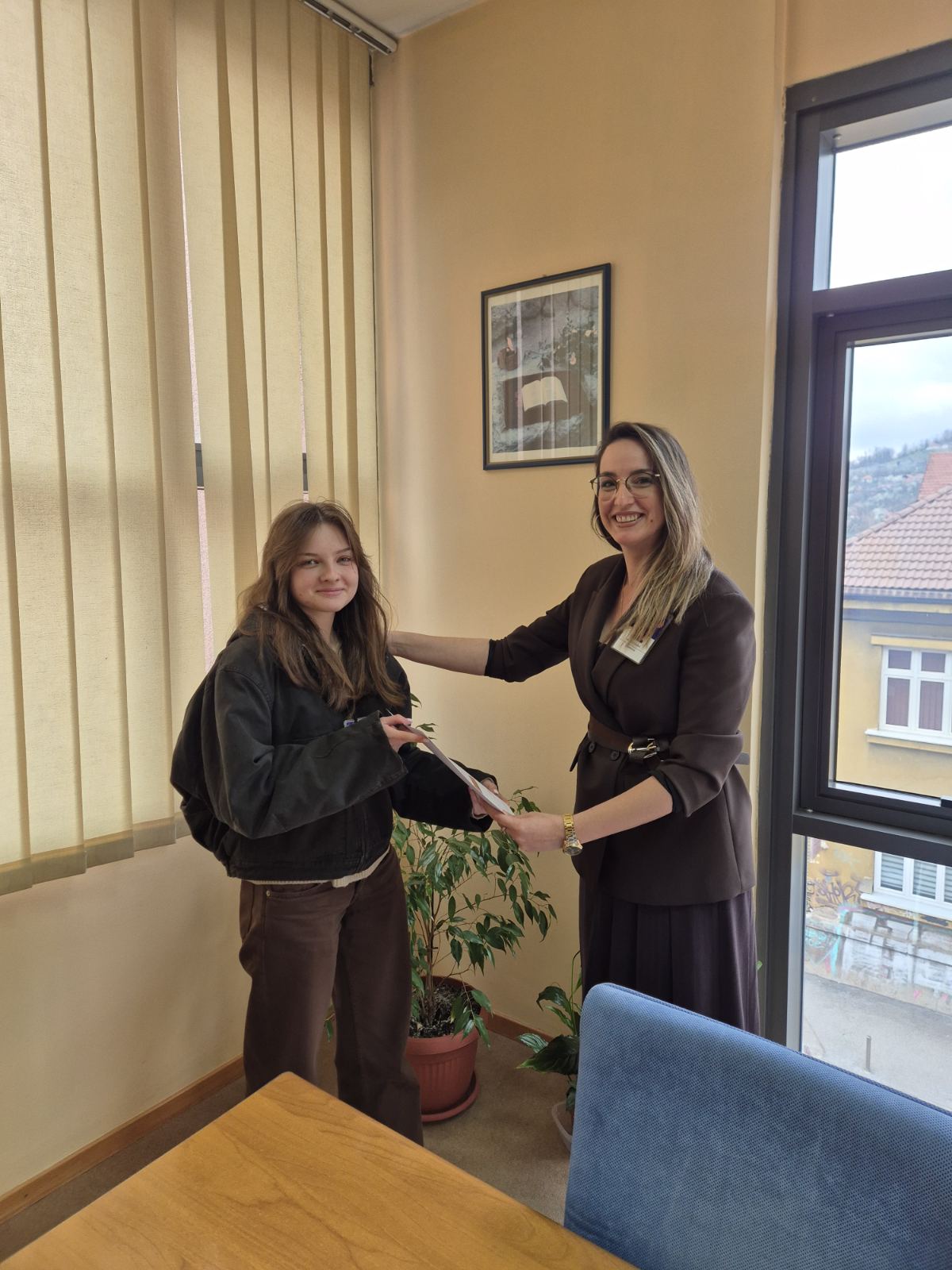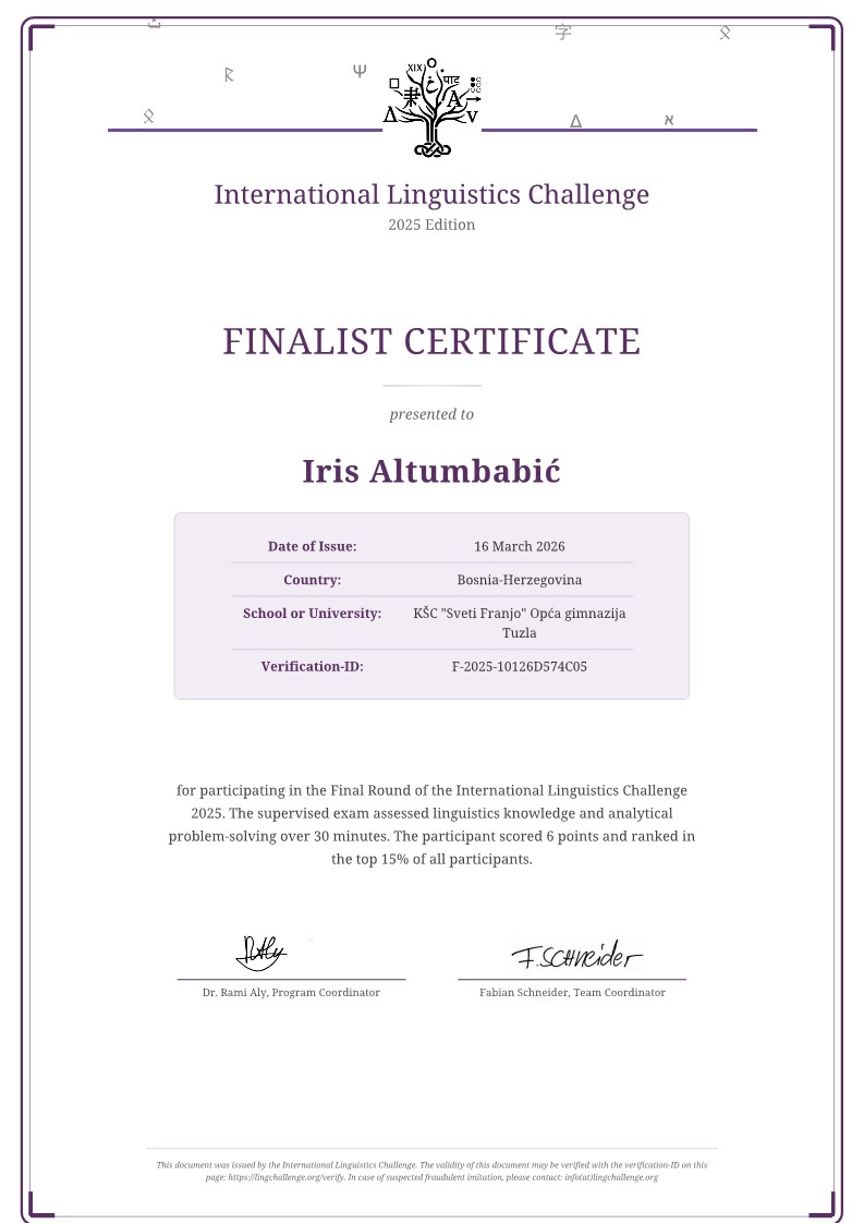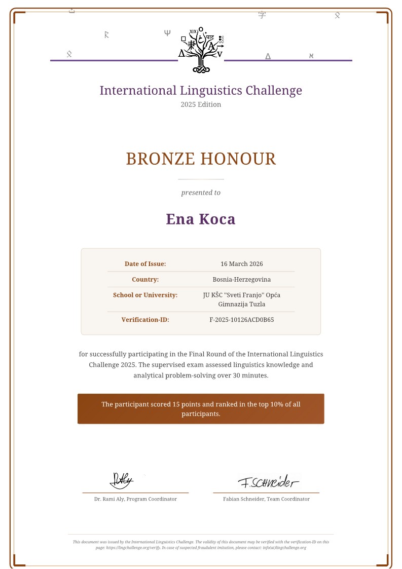 Naše gimnazijalke Ena Koca i Iris Altumbabić sudjelovale su u finalu premijernog izdanja Međunarodnog lingvističkog izazova (The International Linguistics Challenge) namijenjenog srednjoškolcima iz cijeloga svijeta. One su se plasirale u finale održano u srijedu 10. ožujka prethodno uspješno prošavši kvalifikacijski i predfinalni krug. Od ukupno preko 1400 sudionika Ena Koca je završila natjecanje među 10% svih natjecatelja (bronze medalist razina), dok je Iris Altumbabić bila među 15% najboljih. Ena je također dobila priznanje kao nacionalni prvak, tj. najbolja među učenicima iz Bosne i Hercegovine. Važno je napomenuti da se radi o potpuno novom natjecanju, izazovu za koji se djevojke nisu mogle posebno pripremati te da je ovaj uspjeh odraz redovitog učenja i rada na nastavi hrvatskog, engleskog, njemačkog i latinskog jezika. Potpora učenicama je profesor Alen Matošević.