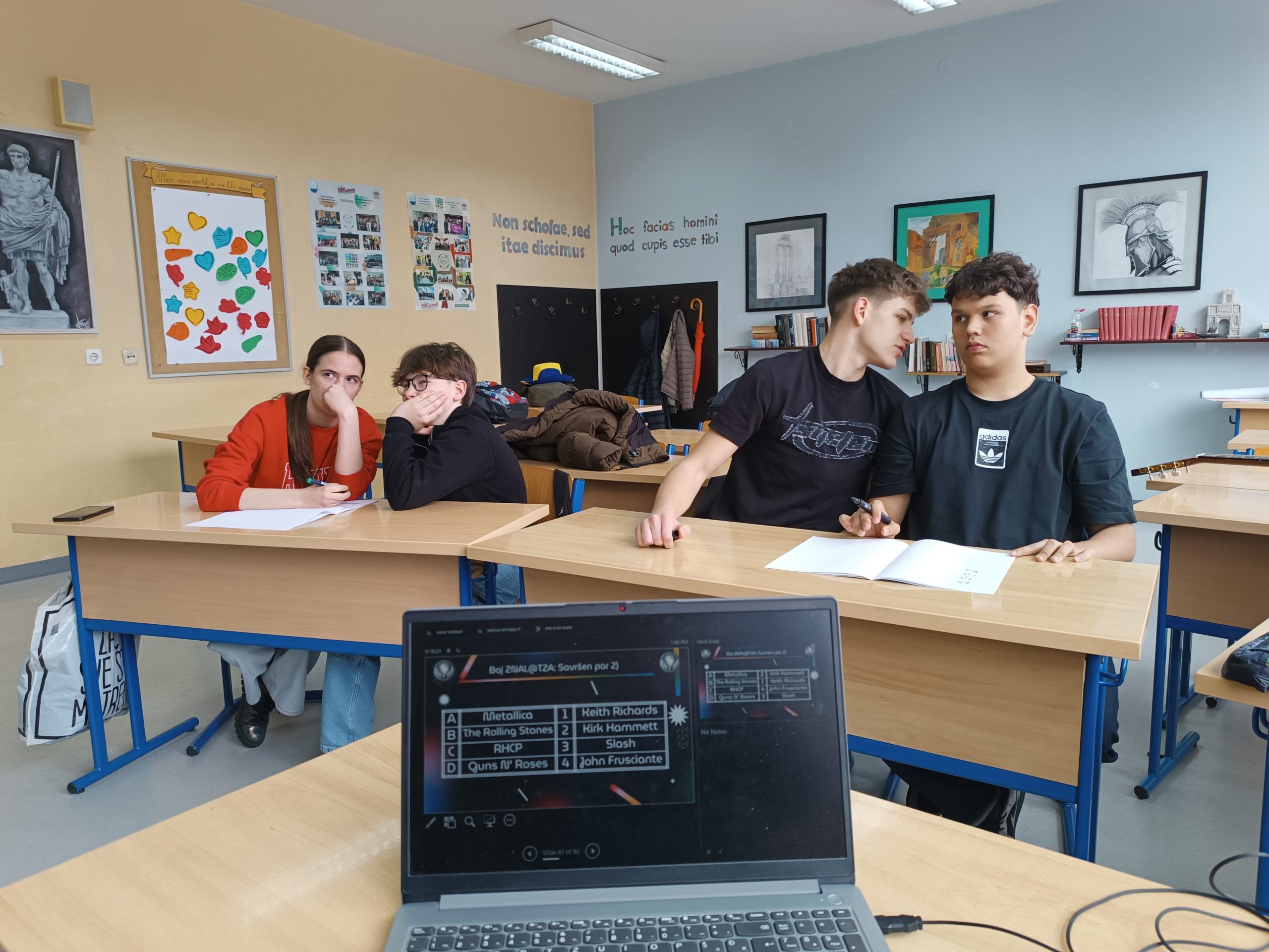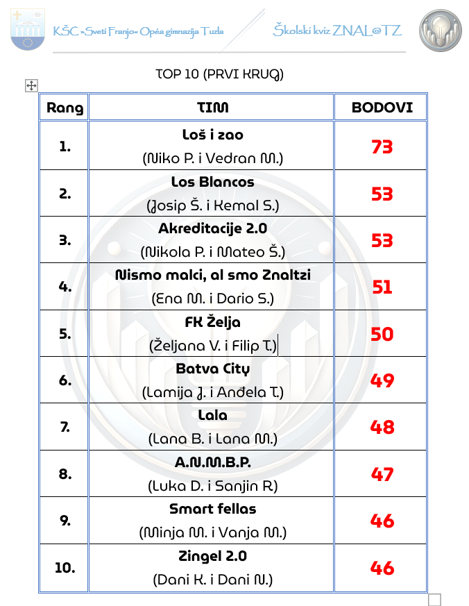 Nakon niza zanimljivih i izazovnih pitanja iz različitih područja, plasman u drugi krug izborilo je 27 najuspješnijih ekipa naših gimnazijalaca i devetaša. Posebna pohvala ekipi »Loš i zao« (Niko Pavić i Vedran Marinović), koja je oborila rekord kviza, ali i svim hrabrim devetašima. Kvizoboj se nastavlja i u narednim danima, a očekuje se još više uzbuđenja i neizvjesnih partija.