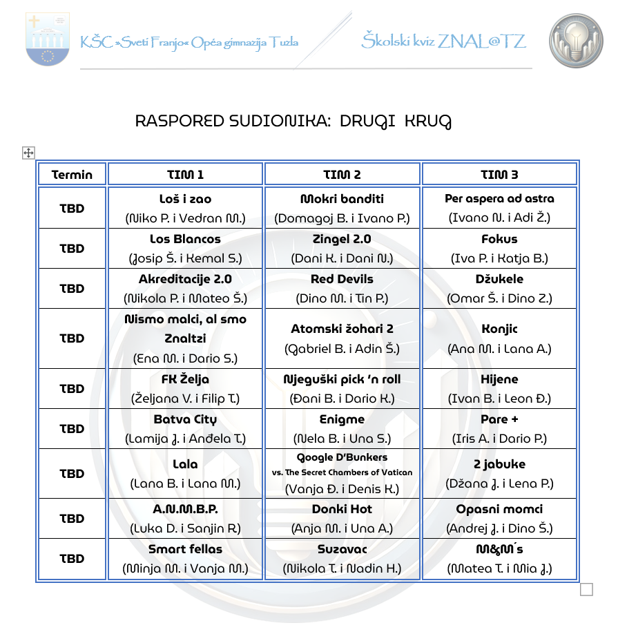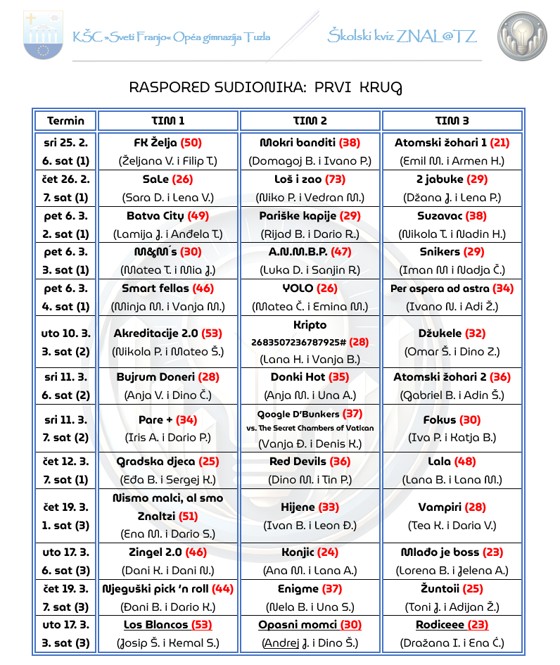 U našoj Gimnaziji uspješno je okončan prvi krug druge sezone školskog kviza Znal@TZ, koji je i ove godine okupio veliki broj učenika željnih dokazivanja i dobre zabave. U prvom krugu sudjelovalo je ukupno 39 ekipa raspoređenih kroz 13 uzbudljivih kvizova.